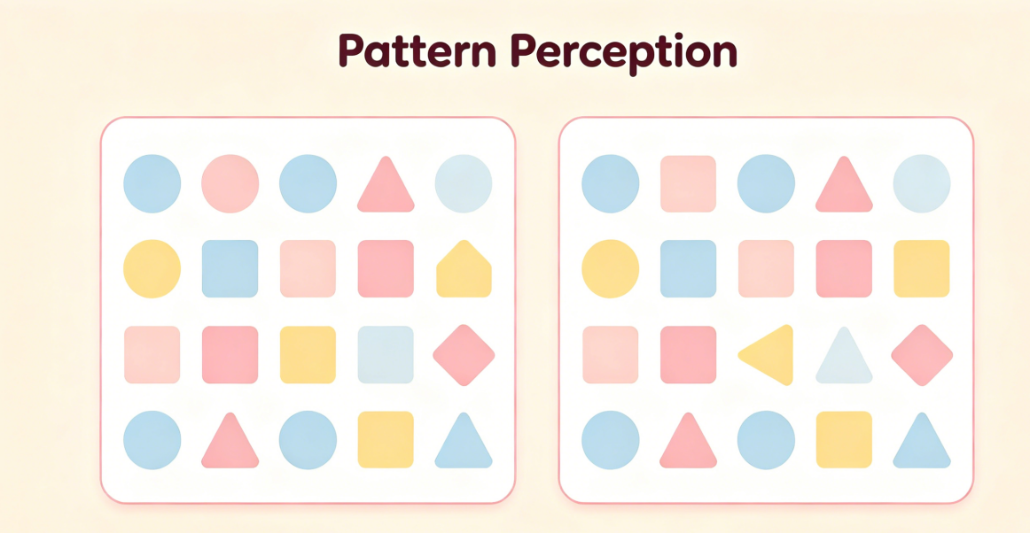 Pattern Perception challenges the user with repetitive and intricate motifs, such as wallpaper designs or textile patterns. The goal is to find five breaks in the repetition between two paired images.