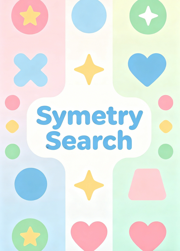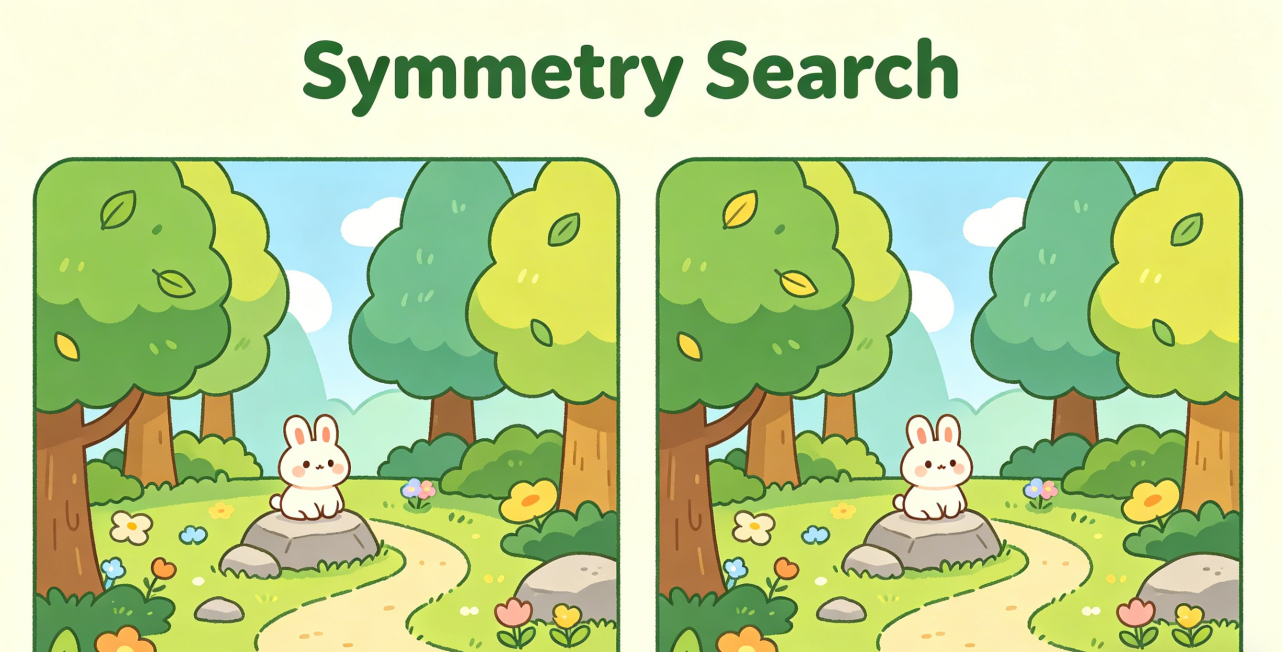 Symmetry Search presents images that should be perfectly mirrored but contain five subtle asymmetries. The user must identify these discrepancies to restore the visual balance of the set.